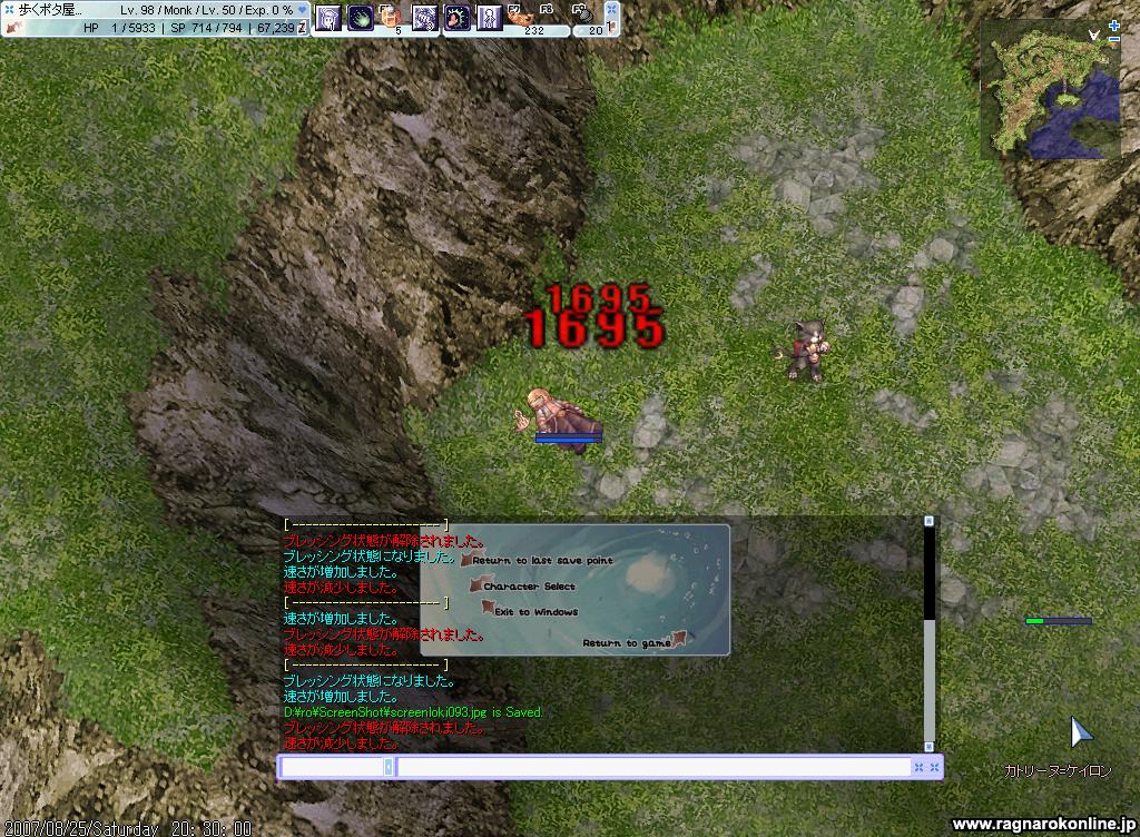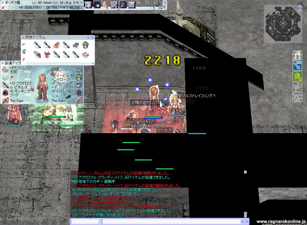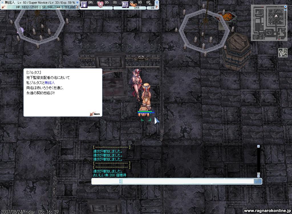 名前が入るのでノビ無銘でいったのだがMOBをどかすのにポタ屋が走り回ったりそれでも死んだりでジョンダ転送がなかったので5.6回ゲフェンからGHを歩いていったり。歩いてる間にどかしていたところにMOBが帰ってきてたり。深夜(?)で人がいなかったからよかった・・・のか?