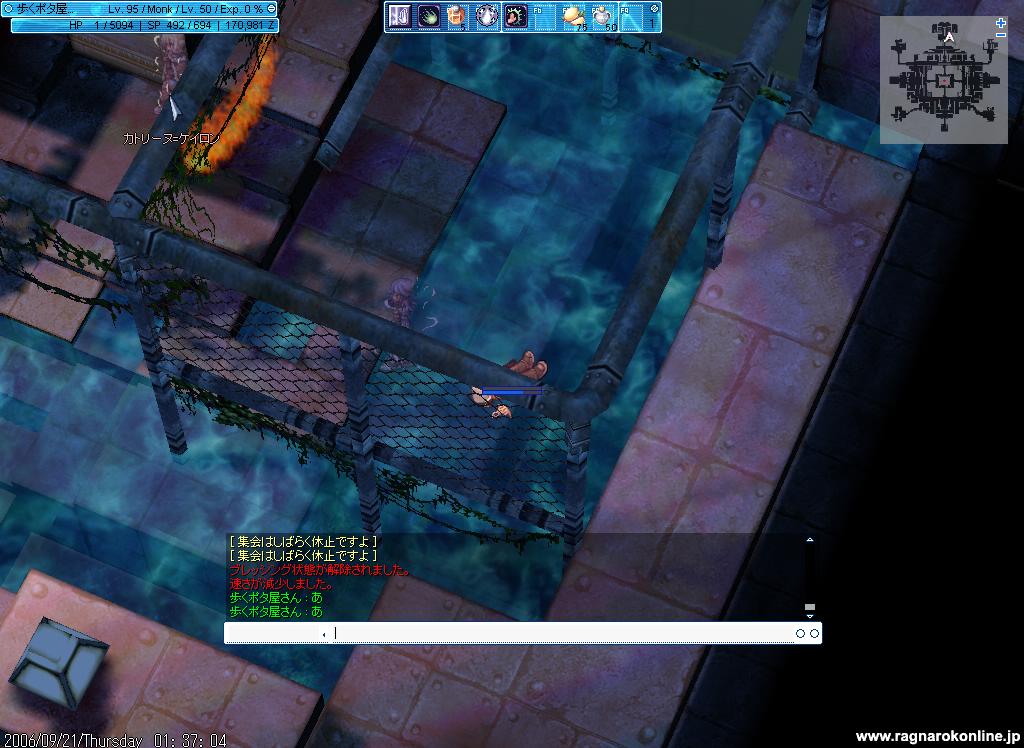 3Fへのワープポイントに何故か居るMVP版イグニゼム=セニアの横を必死で抜けてワープポイント突入→いつもの暗転バグ→画面が写ったら廃wizが隣に→危険を感じて即テレポ→FDで4000ちょい食らうがテレポによるダメージキャンセル→テレポート完了しかしFDの凍結だけは食らって凍結しっぱなし→なんか居る人たち→必死でテレポ入力ミスによる「あ」の連呼→一瞬で死亡→無理です( ´_ゝ`)の図